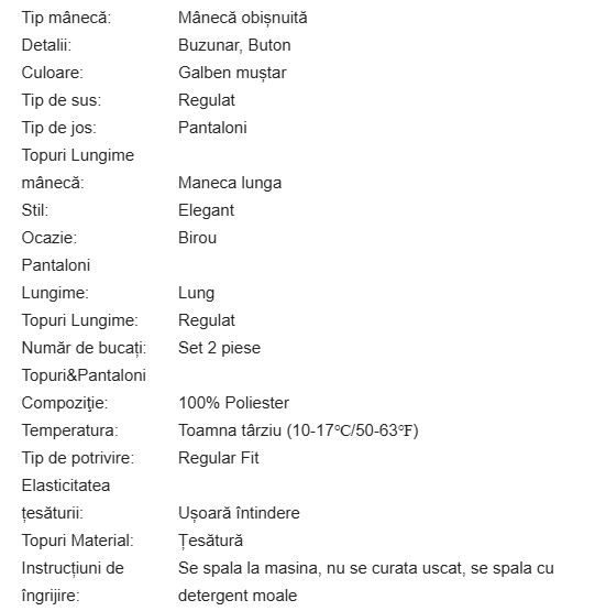 Dacă ești în căutarea unui costum damă office, Solarena poate fi purtat și ca ținută business. Asortează-l cu o cămașă simplă și pantofi eleganți pentru un look impecabil. Descoperă și gama noastră variată de costume damă office cu pantaloni, ideale pentru femeia de carieră.