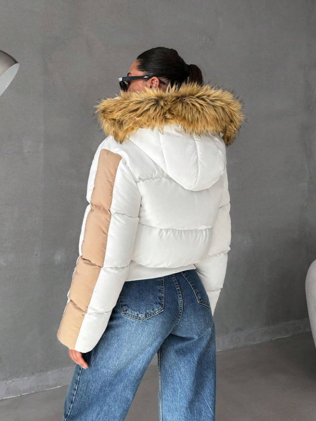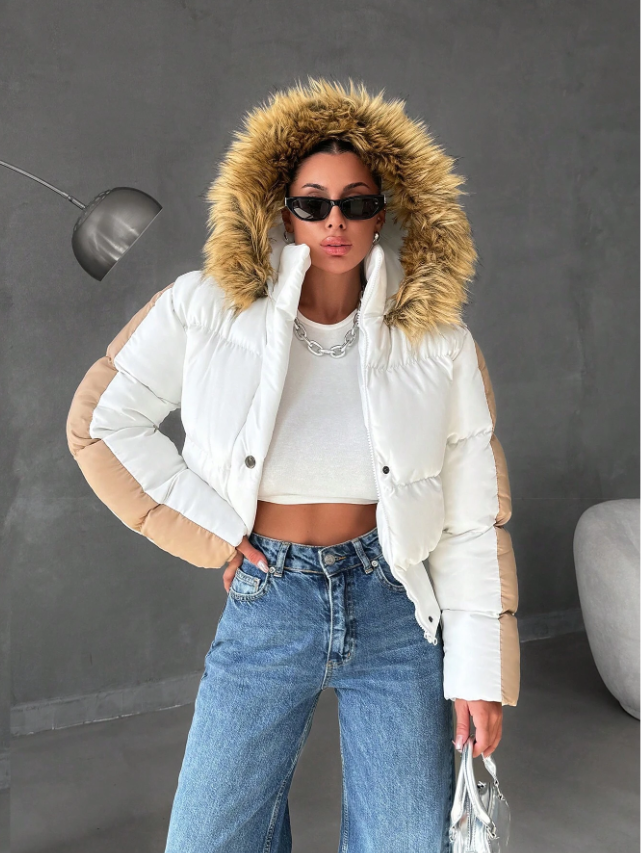Geacă de iarnă damă scurtă cu glugă din puf moale și voluminos