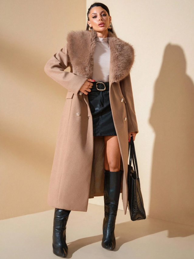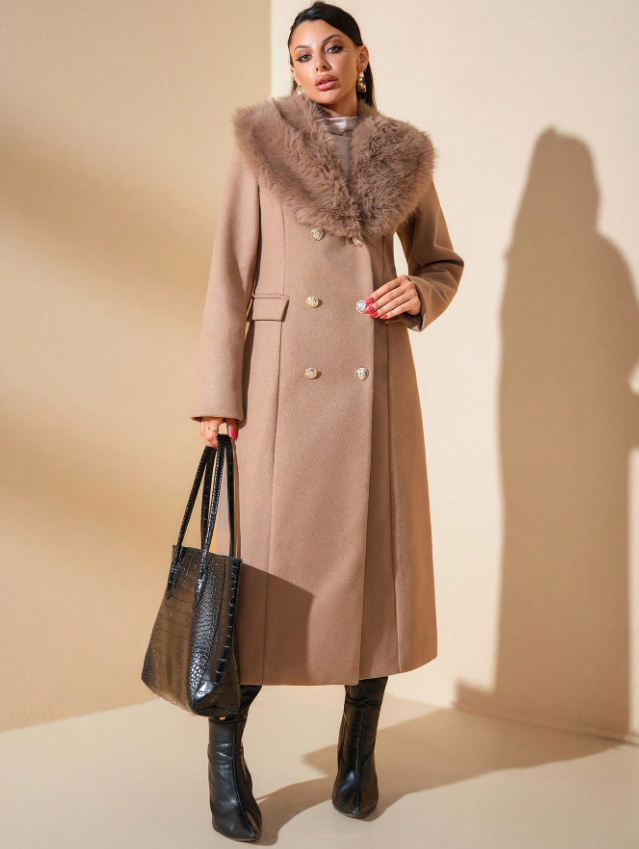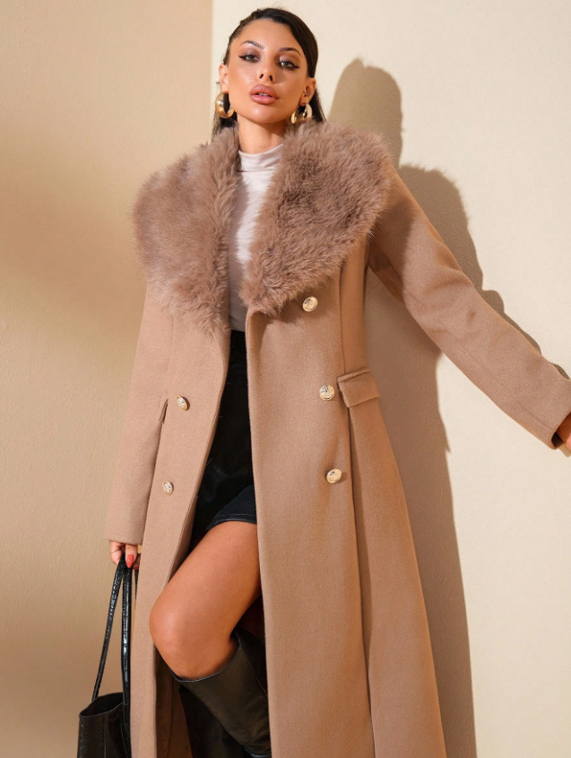 Acest palton lung damă are o croială cambrată, ce subliniază talia și conturează frumos silueta. Gulerul cu blăniță sintetică și nasturii metalici adaugă o notă sofisticată, iar textura plăcută a poliesterului oferă căldură și confort.