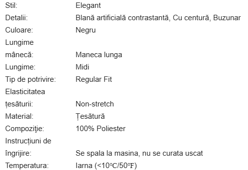 Descoperă acest Palton Damă Iarnă Elegant Vellouria, un model sofisticat de palton dama negru, cambrat, prevăzut cu cordon și blăniță artificială la guler, creat pentru femeia care apreciază paltoane dama elegante și confort termic în sezonul rece. Acest palton de iarnă damă combină eleganța unui palton cambrat dama cu funcționalitatea unui palton gros de iarnă dama, fiind potrivit atât pentru birou, cât și pentru ocazii speciale.